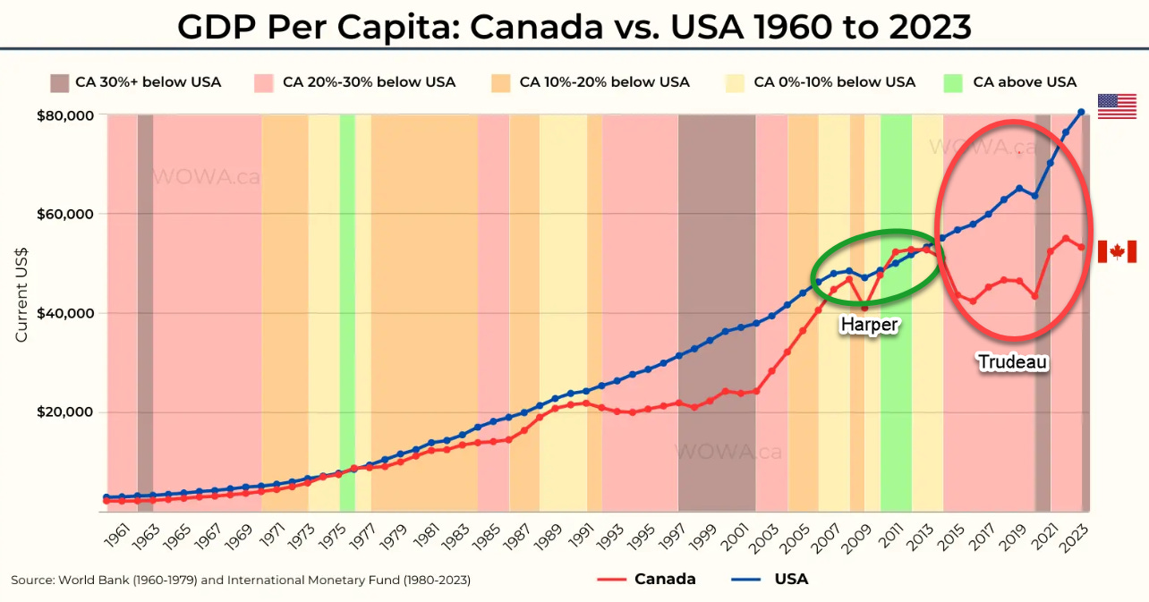 The main reason for Canada’s stumbles is the election of Justin Trudeau, who never met a WEF-sponsored policy recommendation he didn’t like. He subjected the country to a full suite of progressive shibboleths—a dramatic expansion of immigration, commitment to DEI principles, net-zero regulations, meaningless land acknowledgements, neglect of the military, the macabre spectre of MAID (medical assistance in dying), national hand-wringing over truth and reconciliation, the elevation of documents like UNDRIP (United Nations Declaration of the Rights of Indigenous Peoples) over the laws passed by the people’s representatives in provincial and national Parliaments, COVID-era dalliance with the Emergencies Act to quell protests against vaccine mandates, and a dramatic increase in the role and scope of the federal government in the economy and society as a whole.